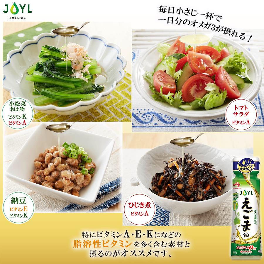 「JOYL 味の素 ごま油」は、えごま油100%・コレステロール0の油で、小さじ1杯で1日分のオメガ3 (n-3系脂肪酸※)が摂れます。オメガ3脂肪酸は皮膚の健康維持を助けるα-リノレン酸です。α-リノレン酸は体内で生成が出来ず、食物から摂らなければならないので必須脂肪酸と呼ばれています。食べやすく、クセのない味わいに仕上げておりますので、サラダやジュース、スープや味噌汁など、いつもの食事に加えるだけで気軽にお召し上がりいただけます。開封後も鮮度が保てる鮮度キープボトルを採用。使う量も調整しやすい、持ちやすいボトルが特長です。※n-3系脂肪酸の1日の摂取目安量:1.6~2.2g(成人)※厚生労働省「日本人の食事摂取基準2020年版」より