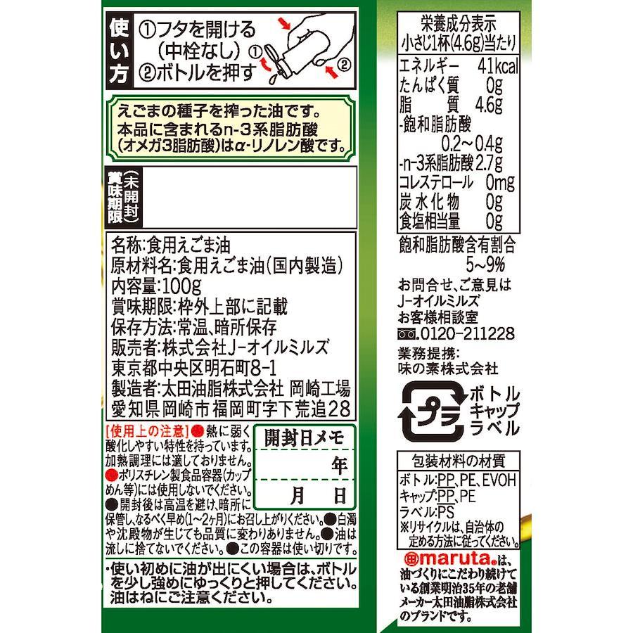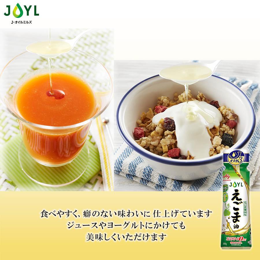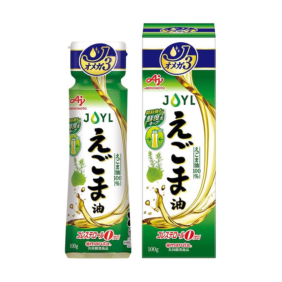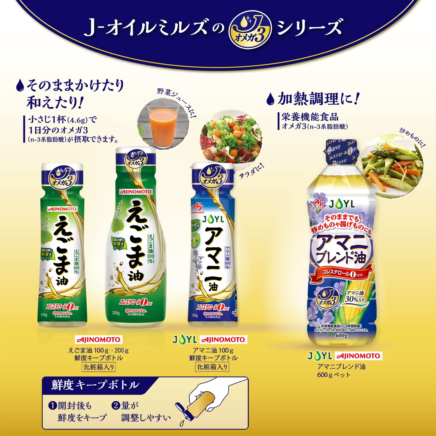 【商品紹介】「JOYL (Jオイル) 味の素 ごま油」は、えごま の種子を搾った えごま油100%。コレステロール0 の油で、小さじ1杯で1日分の オメガ3 (n-3系脂肪酸)が摂れます。毎日、小さじ一杯。食べやすくクセのない味わいなので、サラダやジュースや味噌汁など、いつもの食事にかけるだけで手軽にお召し上がりいただけます。容器は開封後も鮮度を保つ、鮮度キープボトル で、使う量も調整しやすい、持ちやすいボトルが特長です。約1ヶ月で使い切れる100g。【品質】 オメガ3 (n-3系脂肪酸※)は 膚の健康維持を助ける栄養素です。代表的なオメガ3、α-リノレン酸 は、人の体内でつくることができない「 必須脂肪酸 」のひとつで、食物から摂らなければならないので 必須脂肪酸 と呼ばれています。加熱してもオメガ3成分はほぼそのまま残るので、炒めものや揚げものなど、毎日の料理に使えます。※n-3系脂肪酸の1日の摂取目安量:1.6~2.2g(成人)※厚生労働省「日本人の食事摂取基準2020年版」より【使用方法】毎日小さじ一杯で、一日分の オメガ3が摂れます。特に ビタミンA・E・K などの脂溶性ビタミンを多く含む素材と一緒に摂るのがオススメです。※えごま油は熱や光に弱く酸化しやすいため、加熱調理には適しておりません【原材料】食用えごま油(国内製造)【内容量】100g【商品サイズ(高さx幅x奥行)】140x47x47(mm) 【栄養成分】小さじ1杯(4.6g)当たり エネルギー:41kcal、たんぱく質:0g、脂質:4.6g・飽和脂肪酸 : 0.2~0.4g・n-3系脂肪酸:2.7g、コレステロール:0mg、炭水化物:0g、食塩相当量:0g、飽和脂肪酸含有割合:5~9%【重要】メーカーによる商品リニューアルに伴いパッケージ(内容量も含む)変更が行われた場合、新パッケージでお届け致します事ご了承願います。