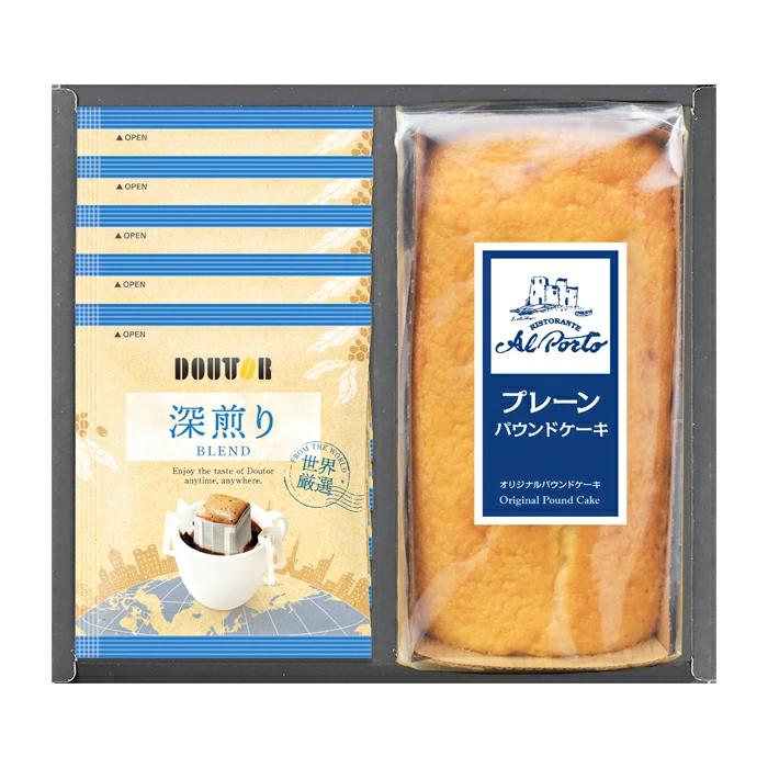 プレーンパウンドケーキ×1、ドトールドリップコーヒー深煎りブレンド7g×5