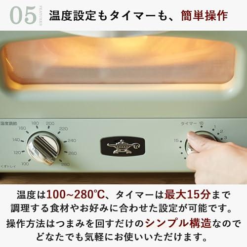 通常1-5営業日で発送:【外はサクサク、中はもっちり】特許技術「遠赤グラファイト」搭載で、発熱するまでの時間はたったの0.2秒。高温の庫内で一気に焼き上げることで、外はカリッと、中は水分が残っているのでモチモチのトーストに仕上がります。【食パンを4枚同時に焼ける広々庫内】トーストなら一度に4枚焼けるほか、グラタンや22cmのピザを焼くことも可能です。焼き網は高さを変えることができるので、高い位置にすればピザトーストのような調理トーストの具材もしっかり焼くことができます。【多彩な調理が楽しめる2種類のグリルパン】2種類の深さのグリルパンが付属しています。グリルパンにふたをして調理すれば、グリルパン内部の温度を330度まで高めることも可能です。これ1台で、焼く・煮る・蒸す・炊くなど、多彩な調理を楽しむことができます。【お手入れのしやすさUP】焼き網を持ち上げることができるので、扉周りに残ったパンくずのお掃除がしやすくなりました。グリルパンはセラミック塗装になり、食材が焦げ付きにくく洗い物も簡単です。フレンチトーストもきれいにはがれます。【商品仕様】◇本体サイズ:幅36×奥行35.5×高さ25cm ◇庫内サイズ:幅31×奥行28.5×高さ9cm ◇本体重量:約4.7kg ◇電源:AC100V ◇消費電力:1390W ◇温度調節:100~280℃ ◇タイマー:最大15分 ◇電源コードの長さ:1m ◇付属品:グリルパン(深)、グリルパン(浅)、グリルプレート、レシピブック、取扱説明書