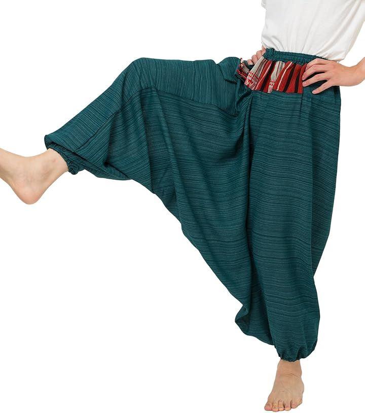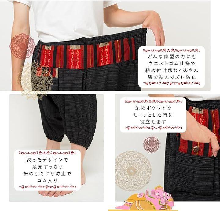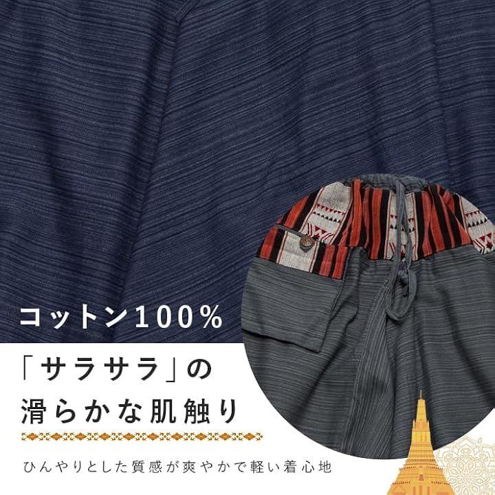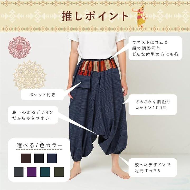 「素材」 このアラジンパンツは、100%コットンで作られており、夏の暑さでも快適な着心地。