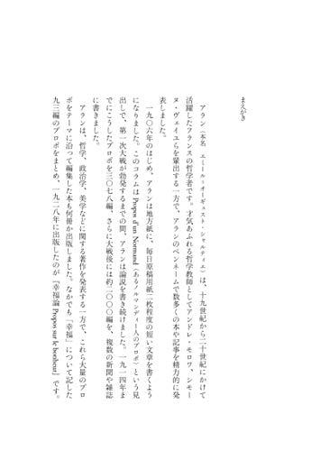 アラン(本名エミール=オーギュスト・シャルティエ)は、19世紀から20世紀にかけて活躍したフランスの哲学者です。才気あふれる哲学教師としてアンドレ・モロワ、シモーヌ・ヴェイユらを輩出する一方で、アランのペンネームで数多くの本や記事を精力的に発表しました。1906年のはじめ、アランは地方紙に、毎日原稿用紙2枚程度の短い文章を書くようになりました。このコラムはPropos d'un Normand(あるノルマンディー人のプロポ)という見出しで、第一次大戦が勃発するまでの間、アランは論説を書き続けました。1914年までにこうしたプロポを3078編、さらに大戦後には約2000編を、複数の新聞や