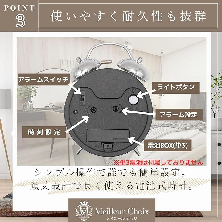 「高音量でしっかり起こす。」 ツインベルと金属ハンマーを採用した大音量設計で、深い眠りの方でもしっかり起床できます。