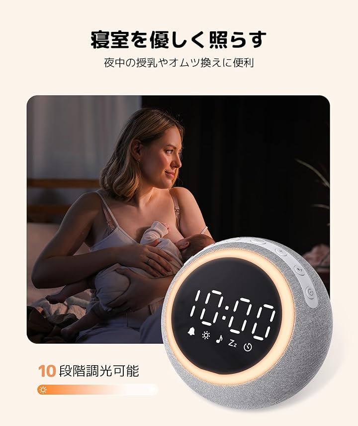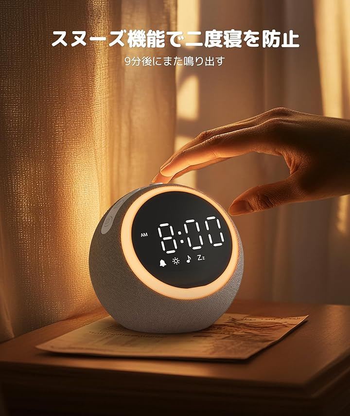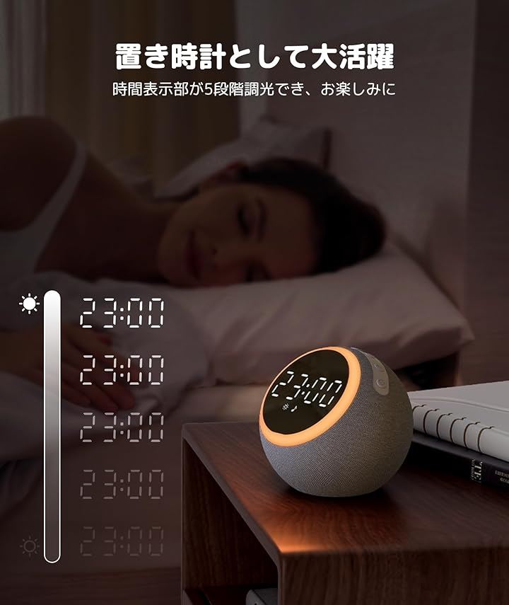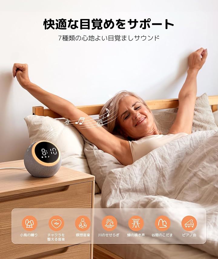 アラームが鳴る時、最初の10秒間、アラーム音量が段々大きくなり、ライトも段々明るくなり、心地よいサウンドで気持ち良い目覚めを迎えます。