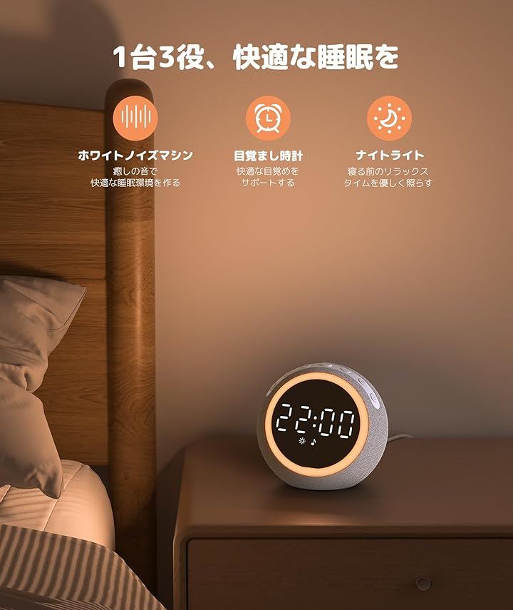 「目覚めの良い朝を迎え」ホワイトノイズマシンSM-01は7種類のアラーム音が用意され、自分の好みでアラーム音と音量をDIYできる目覚まし時計です。