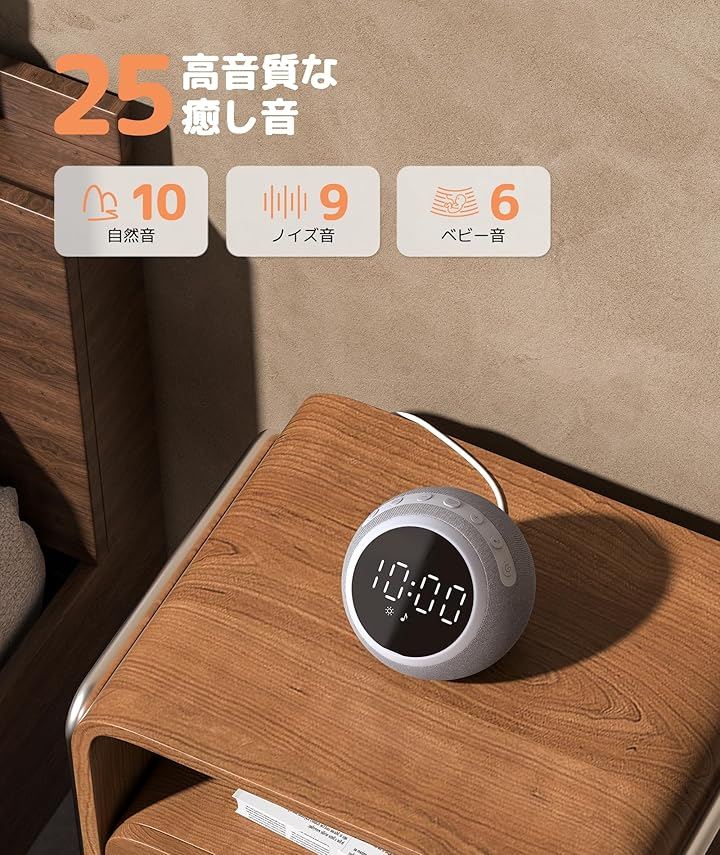 「25種の心を落ち着かせる癒しサウンド」9種のノイズ音、6種のベビー音、10種の自然音が用意されています。