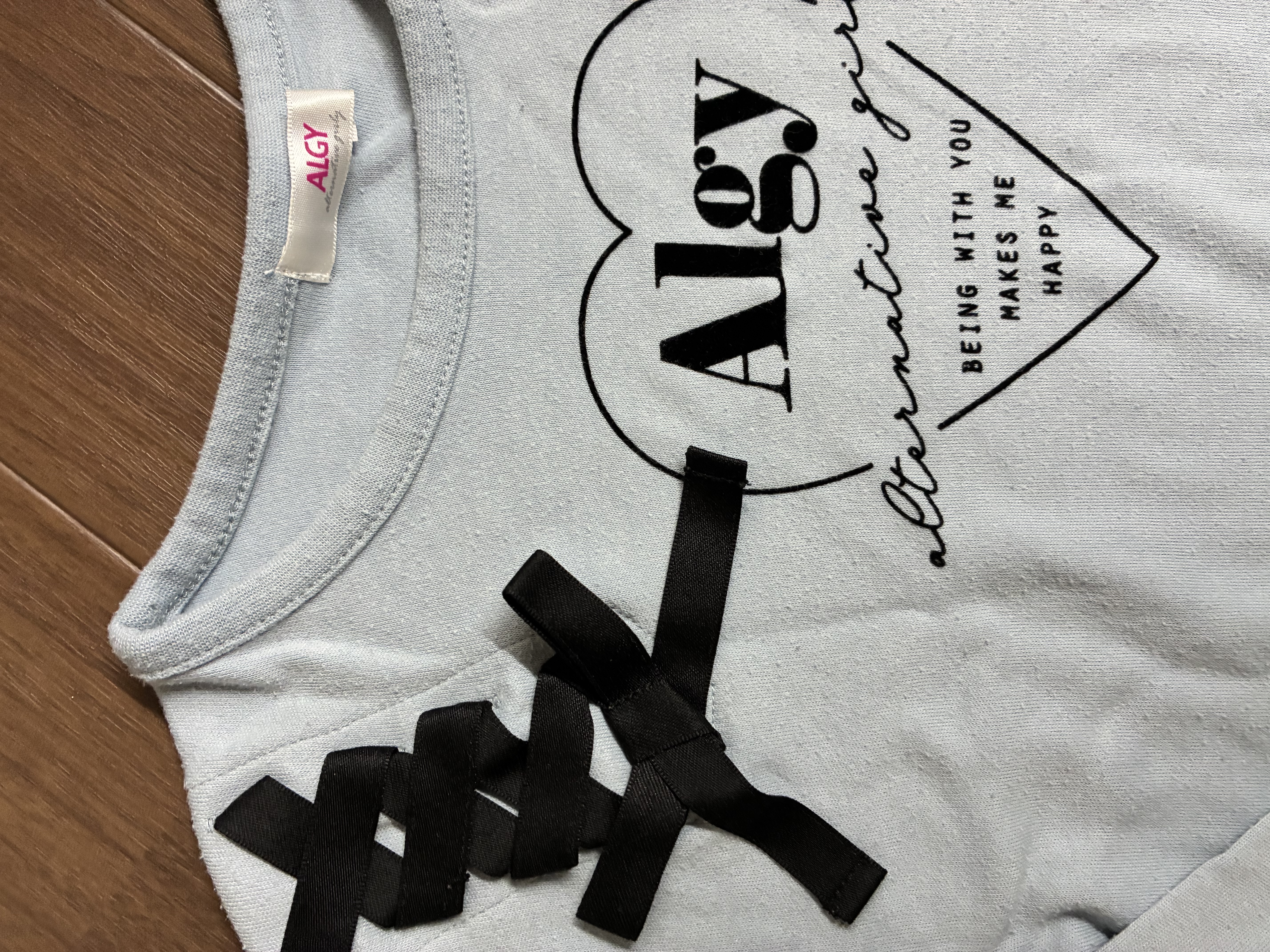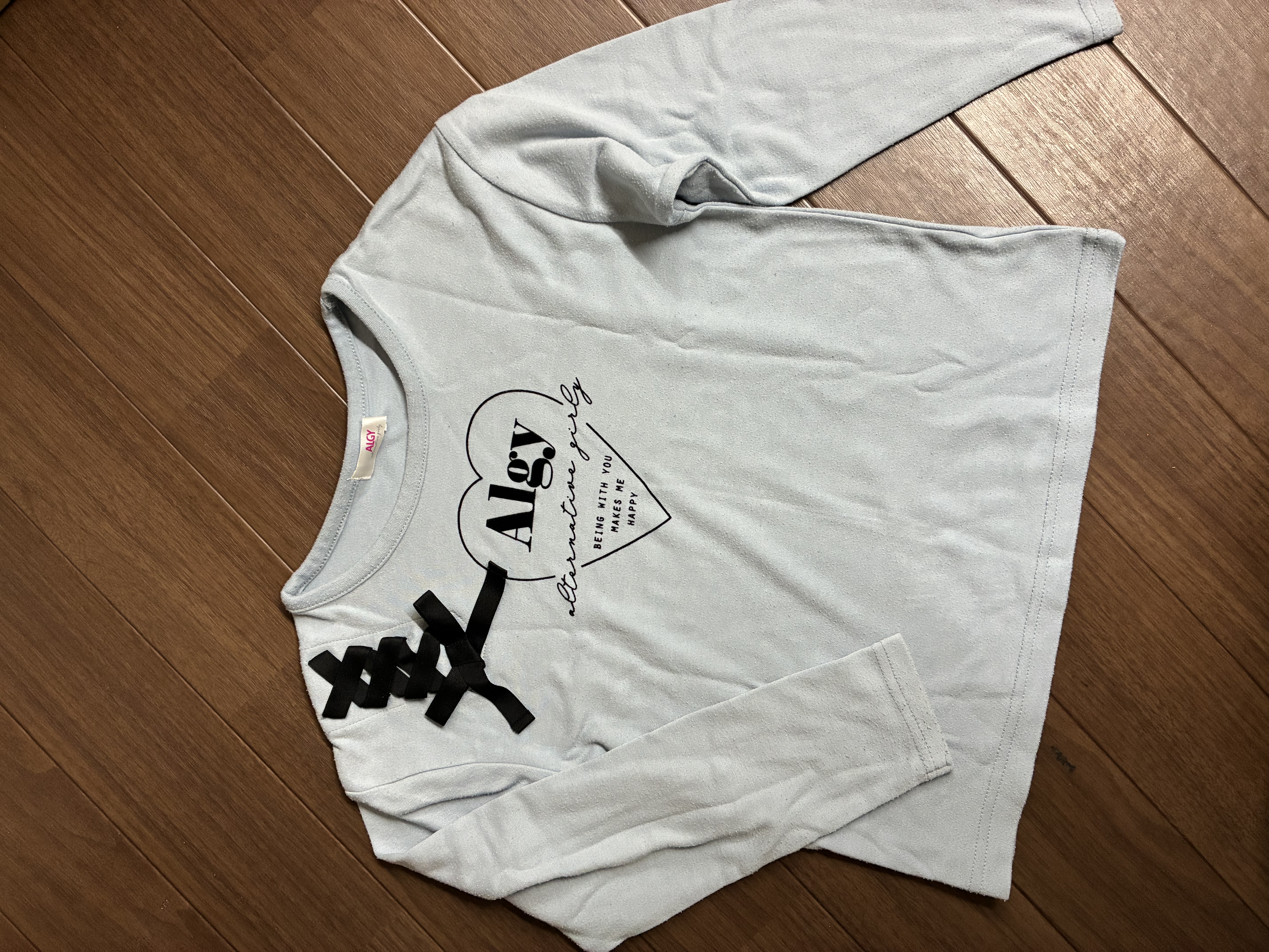Algyの 長袖カットソー サイズ130です。ライトブルーの長袖カットソー、ハートプリントとリボンが特徴の女の子らしいデザインです。