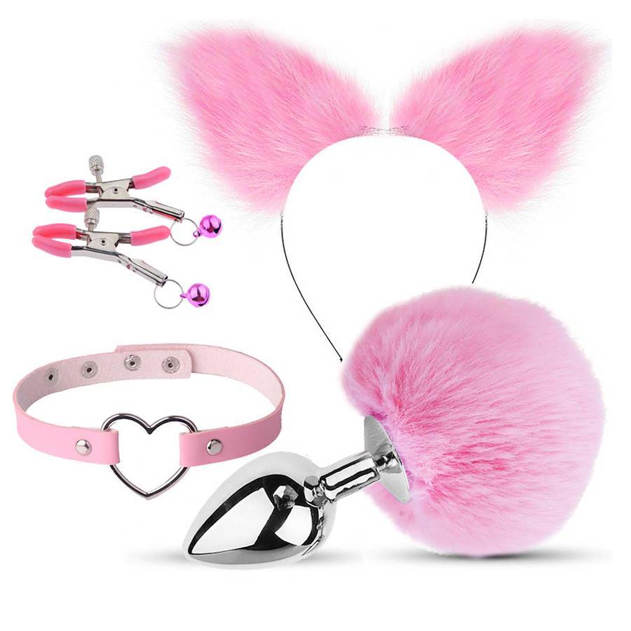 Alip Nipple Stimulation Adult Toy, Anal Tail, Nipple Clips with Bells, Anal Plug, Bunny Tail, Cosplay, Cat Ears, Headband, Choker, 4-Piece Set for Men and Women, Collar, Human SM Restraints