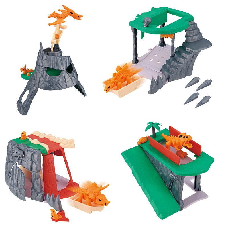 フィギュアとジオラマがセットになり、組み合わせて遊べる「ほねほねザウルス」のシリーズ商品です。ジオラマには落とし穴や滝が開いてほねほねザウルスが発進するなどのさまざまなギミックが満載です。全種類集めて合体させると、巨大な鬼の顔のような「秘密基地」が完成します。全高約280mmの大ボリューム!