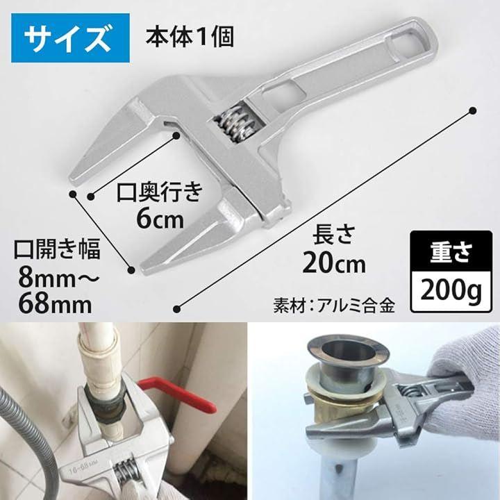 「商品詳細」商品内容:本体1個、サイズ:長さ20cm,口奥行き6cm,口開き幅:8mm~68mm、重さ:200g、素材:アルミ合金