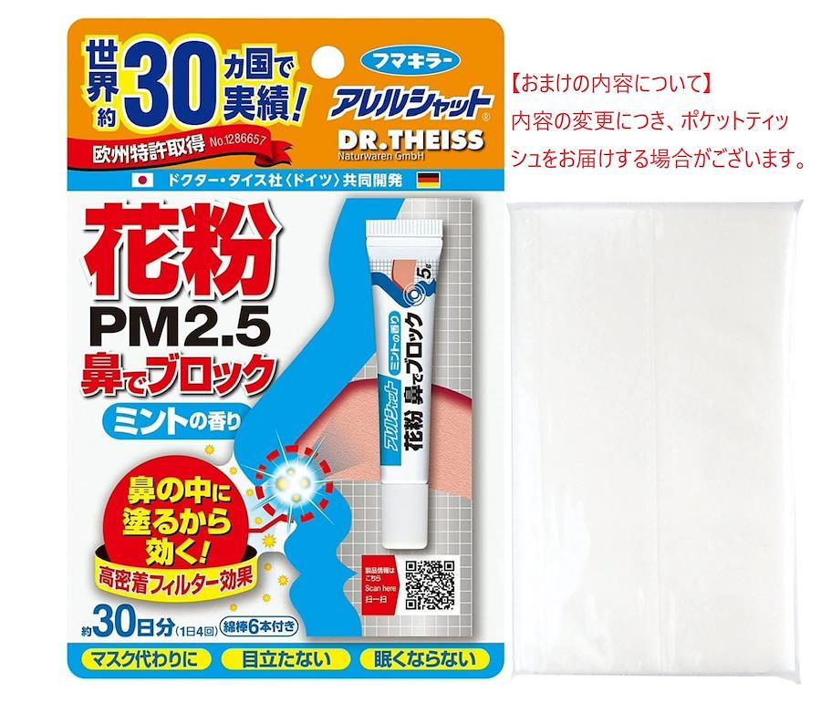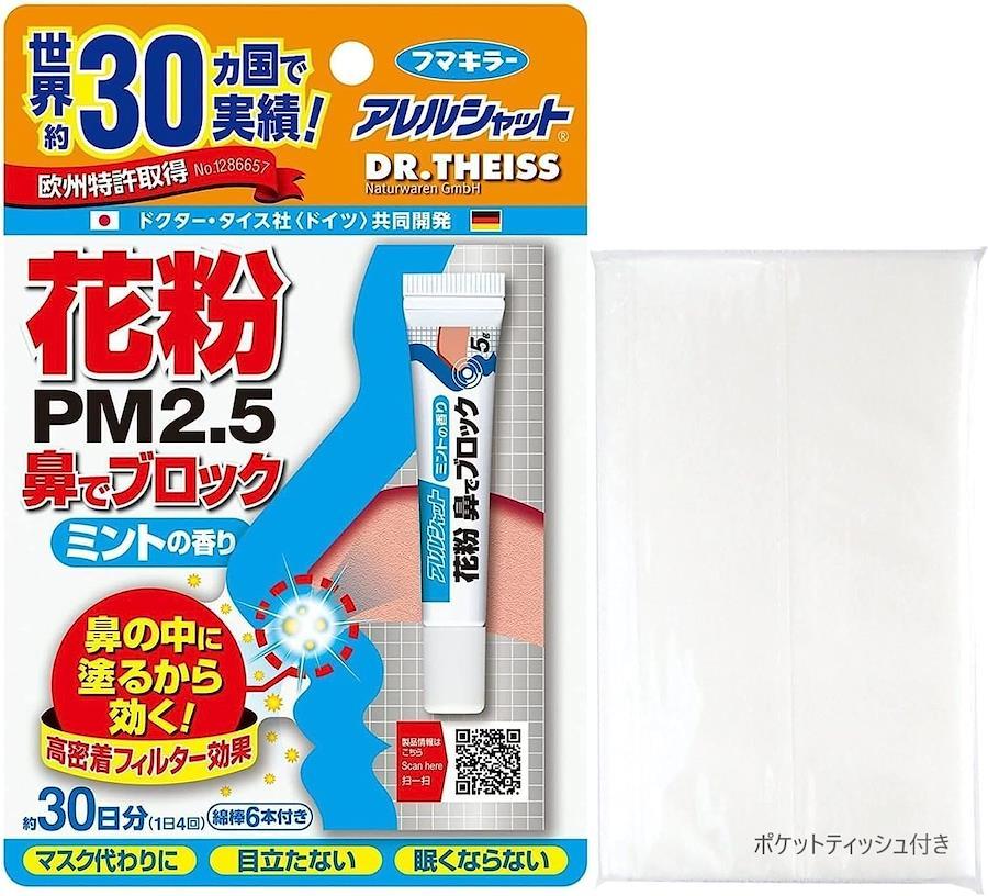 商品紹介 鼻にぬるだけで、花粉の吸入を防止する鼻腔クリームです。クリームのフィルター効果で花粉をキャッチ。鼻の中にしっかりとどまり、花粉・ハウスダストの吸入を防止します。刺激がないので、敏感になった鼻にも安心して使用できます。鼻の中にぬるので目立たず、化粧崩れの心配もありません。着色料、保存料を一切使用していません。ミントの香り。約30日分。 原材料・成分 精製長鎖炭化水素 鼻の中に塗るだけで花粉をブロック 鼻にぬるだけで、花粉の吸入を防止する鼻腔クリームです。 鼻の中にしっかりとどまり、花粉・ハウスダストの吸入を防止します。 鼻の中にぬるので目立たず、化粧崩れの心配もありません。 内容量:5g(30日分) 香り:ミント おまけの内容が予告なく変更となり場合がございます。 おまけのご希望や交換はお伺い・ご対応できかねますので、あらかじめご了承お願いいたします。