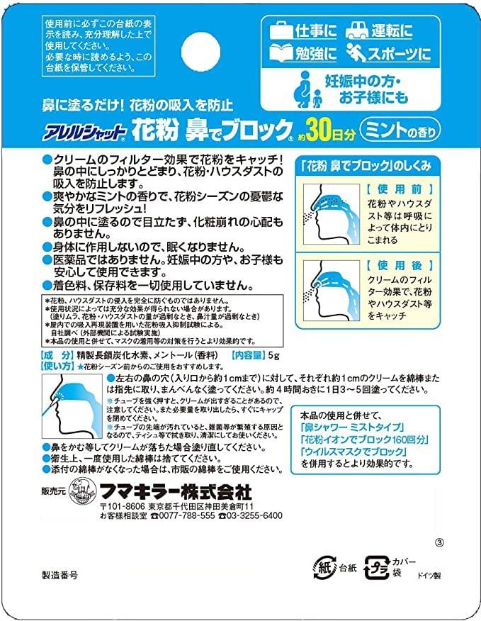 商品紹介 鼻にぬるだけで、花粉の吸入を防止する鼻腔クリームです。クリームのフィルター効果で花粉をキャッチ。鼻の中にしっかりとどまり、花粉・ハウスダストの吸入を防止します。刺激がないので、敏感になった鼻にも安心して使用できます。鼻の中にぬるので目立たず、化粧崩れの心配もありません。着色料、保存料を一切使用していません。ミントの香り。約30日分。 原材料・成分 精製長鎖炭化水素 鼻の中に塗るだけで花粉をブロック 鼻にぬるだけで、花粉の吸入を防止する鼻腔クリームです。 鼻の中にしっかりとどまり、花粉・ハウスダストの吸入を防止します。 鼻の中にぬるので目立たず、化粧崩れの心配もありません。 内容量:5g(30日分) 香り:ミント おまけの内容が予告なく変更となり場合がございます。 おまけのご希望や交換はお伺い・ご対応できかねますので、あらかじめご了承お願いいたします。