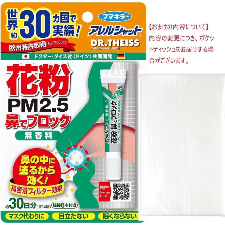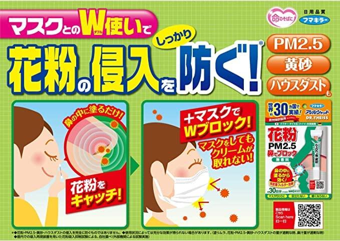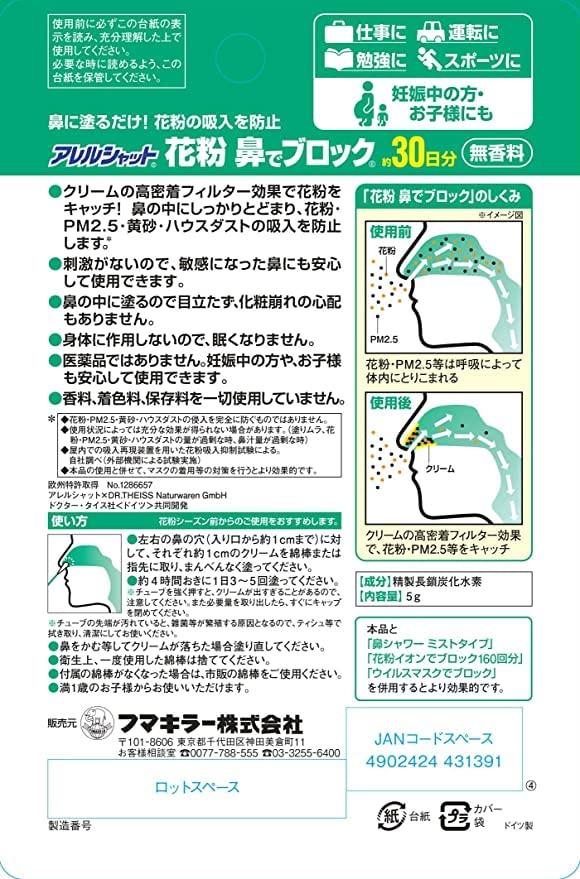 商品紹介 鼻にぬるだけで、花粉の吸入を防止する鼻腔クリームです。クリームのフィルター効果で花粉をキャッチ。鼻の中にしっかりとどまり、花粉・ハウスダストの吸入を防止します。刺激がないので、敏感になった鼻にも安心して使用できます。鼻の中にぬるので目立たず、化粧崩れの心配もありません。身体に作用しないので、眠くならず、妊娠中の方やお子様も安心して使用できます。香料、着色料、保存料を一切使用していません。約30日分。 原材料・成分 精製長鎖炭化水素 鼻の中に塗るだけで花粉をブロック 鼻にぬるだけで、花粉の吸入を防止する鼻腔クリームです。 鼻の中にしっかりとどまり、花粉・ハウスダストの吸入を防止します。 鼻の中にぬるので目立たず、化粧崩れの心配もありません。 内容量:5g(30日分) おまけの内容が予告なく変更となり場合がございます。 おまけのご希望や交換はお伺い・ご対応できかねますので、あらかじめご了承お願いいたします。