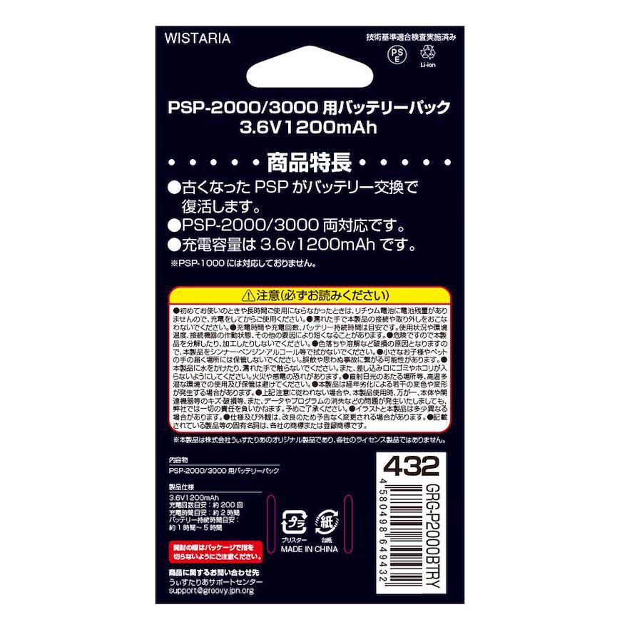 [Compatible models]For PSP-2000/PSP-3000Capacity:3.6v 1200mAhWeight:Approx. 1.4 oz (40Model Number: GRG-P2000BTRY (Can be played again with PSP) This is a battery pack for PSP-2000/PSP-3000. PSPs that are unable to charge are also returned by replacing the battery pack. Do you want to play again with a classic masterpiece? It is also recommended to have it as a spare. This product is PSE certified, so you can use it with confidence 【Eliminates battery pack life problem】Battery pack has a long life. The battery life will be a little shorter due to the number of charge times and aging. When the battery life becomes visible and short, the deterioration is progressing. We recommend replacing it with a new product before inflating Recommended for those who use this product is high and does not come out of your hands. The battery you use is now worse. The battery you have expanded and unused. You want a quality battery [Enhanced Inspection] In addition to regular inspection, we conduct a final inspection before shipping, to ensure that our customers receive a reliable product. Our products are well inspected so that we are able to offer you a quality product [Reliable Japanese Manufacturer] We carefully inspect the goods before shipping to ensure your satisfaction. In addition, we have a complete support system, so if there is a defective product, we will immediately replace it with a new one. (*For products that have been finished production, we will refund the purchase price for full refund. )