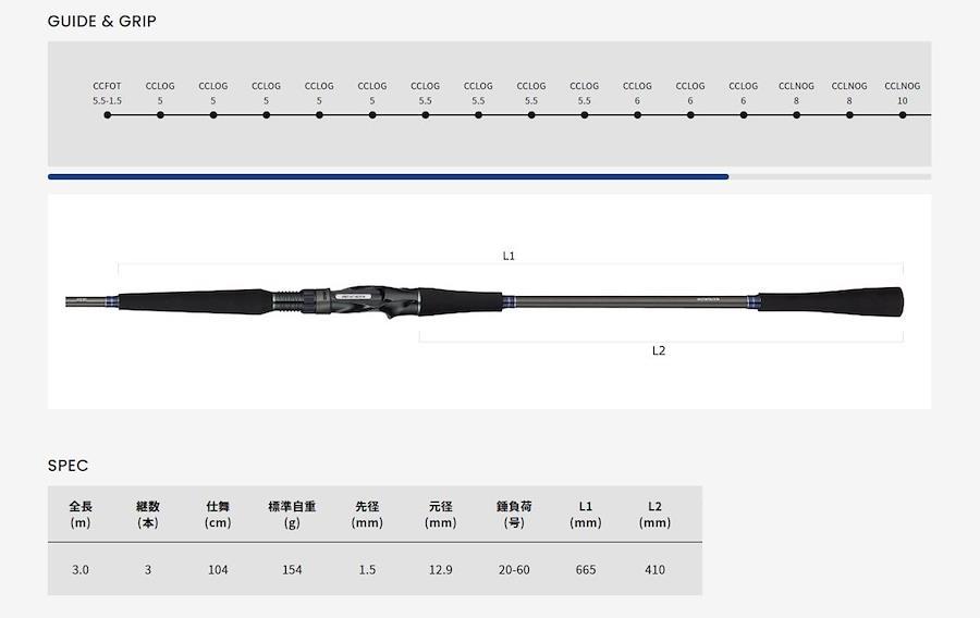全長:3m継数:3本/仕舞:104cm自重:154g錘負荷:20-60号