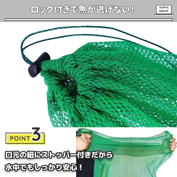 「ロック紐で安心キープ」引き紐にストッパー付きで魚が逃げにくく、流れのある川でも安心して使用できます。