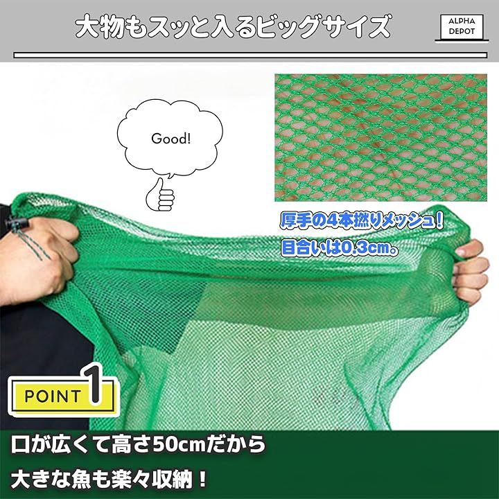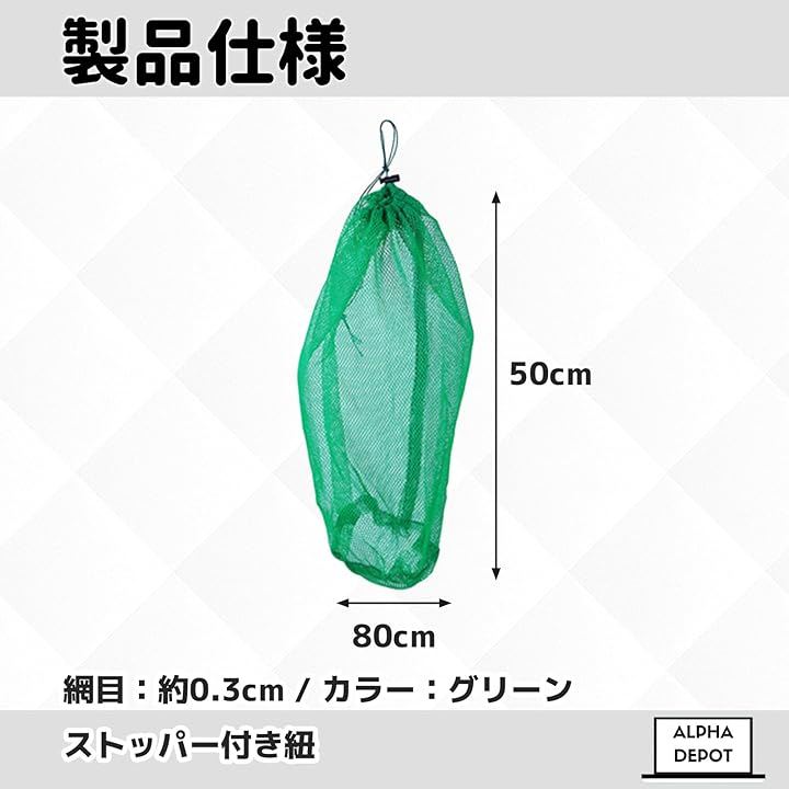 「製品仕様」全長:約50cm/幅:約80cm/網目:約0.3cm/カラー:グリーン/ストッパー付き紐・折りたたみ収納対応 [注意事項]本製品には説明書が付属しておりません。