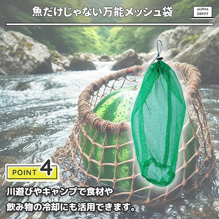 「アウトドアでも大活躍」釣りだけでなく、川での食材冷却やキャンプ時の収納袋としても重宝する多用途なメッシュバッグです。