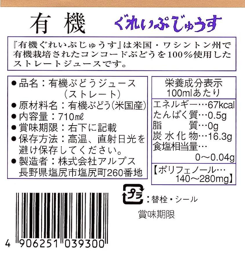 内容量:710ml原材料:有機ぶどう(米国産)商品サイズ(高さ×奥行×幅):295mm×75mm×75mmブラント名: アルプスメーカー名: アルプス【重要】メーカーによる商品リニューアルに伴いパッケージ(内容量も含む)変更が行われた場合、新パッケージでお届け致します事ご了承願います。