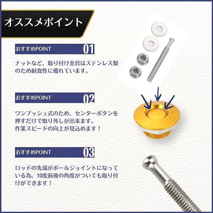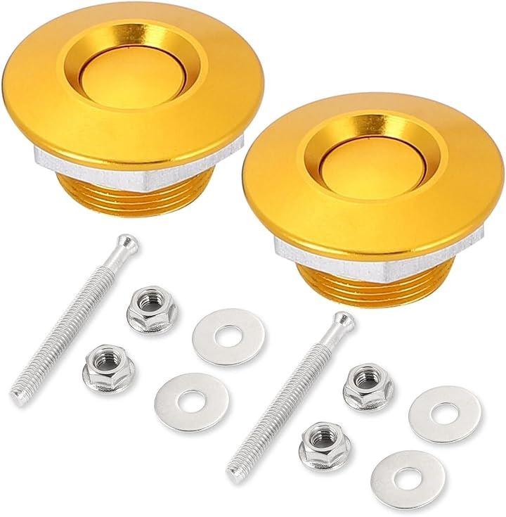 スタイリッシュで便利なボンネットピンゴールド2個セットです。クイックリリース機能が付いた高品質なアルミニウム合金製で、使い勝手抜群です。