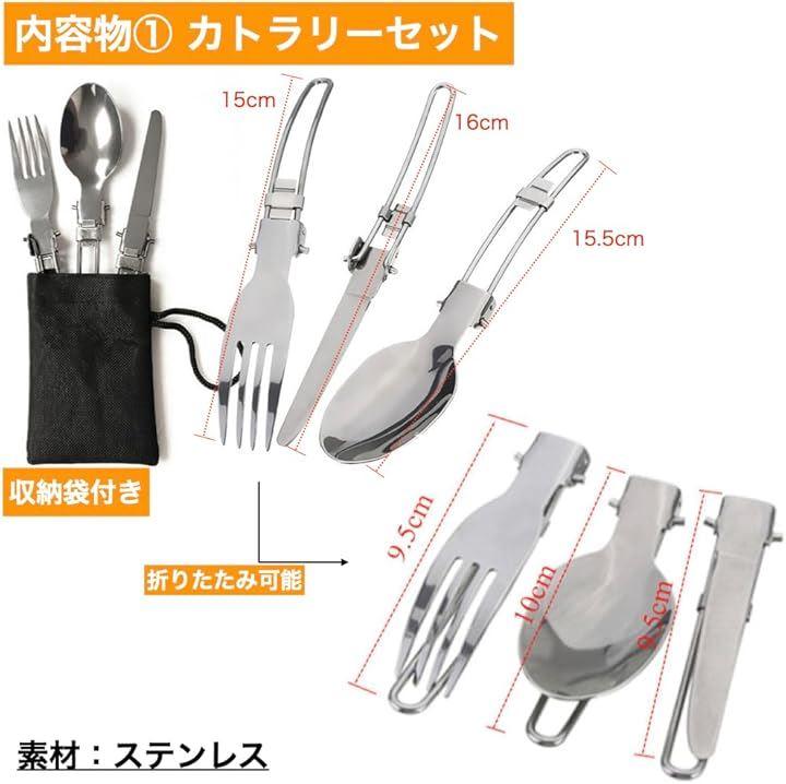 「セット内容」アルミニウム鍋x2、収納袋x2、ステンレスのスプーンx1、ステンレスのフォークx1、ステンレスのナイフx1、使用人数:1~2名様をお勧めます。