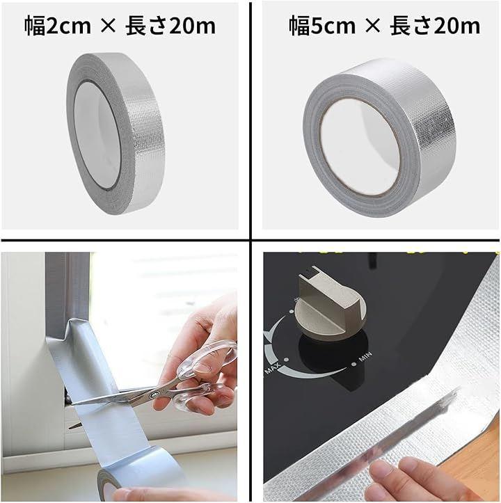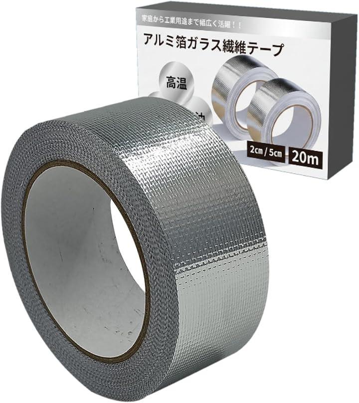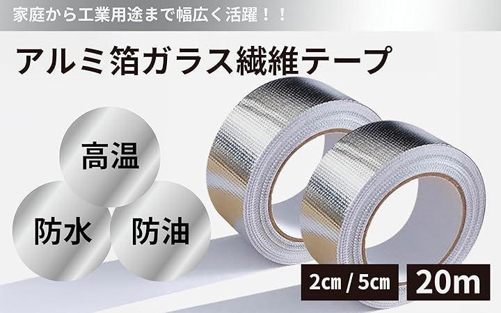 「商品名」アルミ箔ガラス繊維テープ(耐高温・防水・防油) 「セット内容」アルミ箔テープ x 1巻 「サイズ」(1)幅2cm x 長さ20m(2)幅5cm x 長さ20m 「素材」アルミ箔+ガラス繊維布+強力粘着剤 「カラー」シルバー 「用途」窓やドアのすき間防止、防音、防塵・配管の補修、防錆、防湿・キッチンの油はね防止、清掃補助