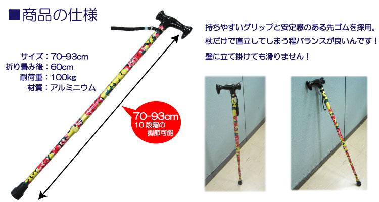 〇商品仕様持ちやすいグリップと安定感のある先ゴム。杖だけで直立してしまう程のバランスの良さ。壁に立て掛けてもすべりません。 ●サイズ:70-93cm 折りたたみ後:60cm ●耐荷重:100kg ●材質:アルミニウム ●中国製 ●ポリ袋入り規格持ちやすいグリップと安定感のある先ゴム。杖だけで直立してしまう程のバランスの良さ。壁に立て掛けてもすべりません。
