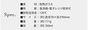 【サイズ】 (約)直径78×高さ90mm 【重 量】 約111g 【素 材】 耐熱ガラス 【容 量】 約300ml 【耐熱温度差】 120℃
