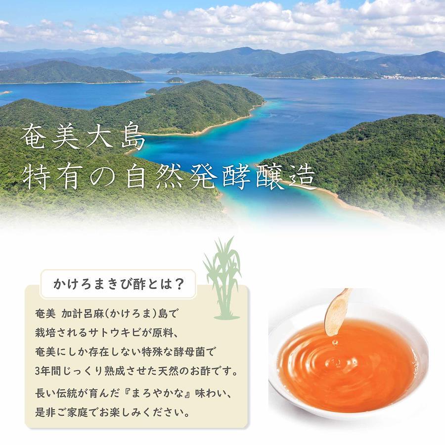 「かけろま きび酢 700ml」は、奄美の良質な「さとうきび」のみを原料とし、伝承された熟成法で丹精こめて手作りされたお酢です。この地域にしか浮遊していない酵母菌によって自然発酵、さらに3年間じっくりと醸造熟成され、様々な食酢の中でも高い含有成分を含んでいます。