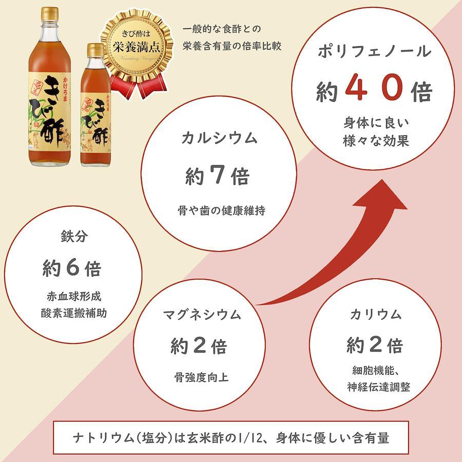 お酢は大切な調味料であるだけでなく、健康維持に大きく貢献します。本品には、日本人に不足しがちなカルシウム・カリウム・鉄等、身体に必要な成分が豊富に含まれており、その一方ナトリウム(塩分)が極端に少ないのが特長です。