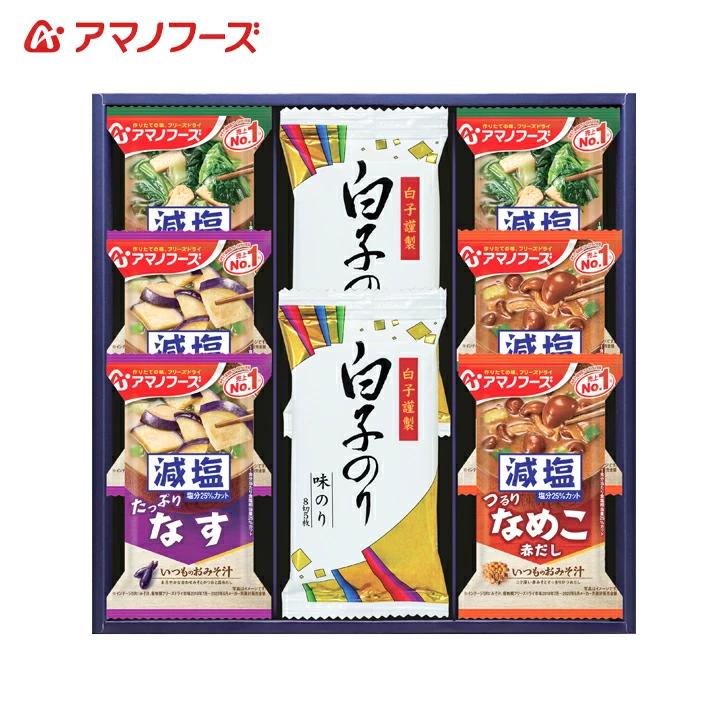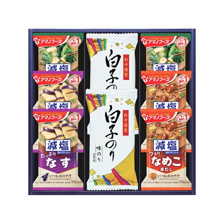 白子味のり(8切5枚)、アマノフーズ減塩いつものおみそ汁(なす9g、なめこ8g、ほうれん草6.8g)×各2
