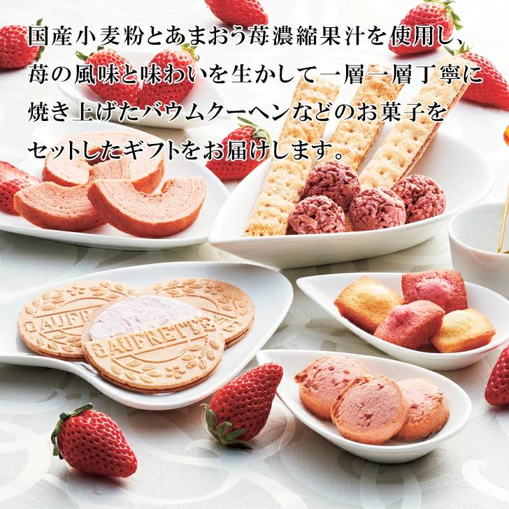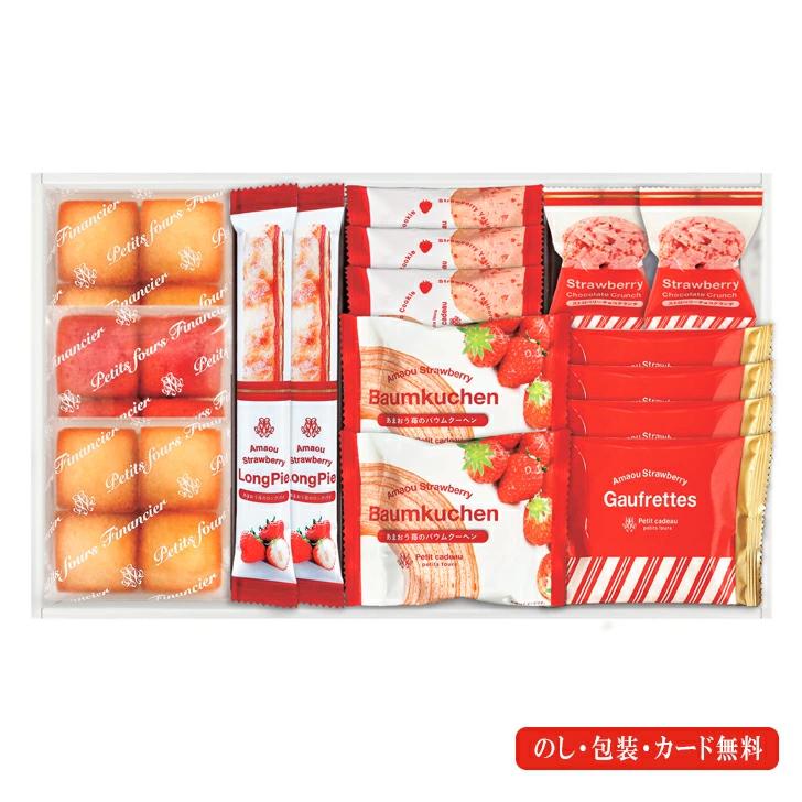 あまおう苺ゴーフレット×4、焼きほろろイチゴクッキー×3、あまおう苺バウムクーヘン、あまおう苺ロングスティックパイ、ストロベリーチョコクランチ、プチフィナンシェ4個入(プレーン)×各2、プチフィナンシェ4個入(あまおう苺)×1、消味期限:90日【卵、乳、小麦】