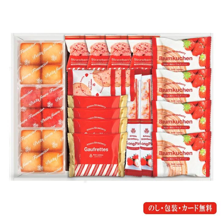 あまおう苺バウムクーヘン、あまおう苺ゴーフレット、ストロベリーチョコクランチ×各4、焼きほろろイチゴクッキー×3、プチフィナンシェ4個入(あまおう苺)×1、あまおう苺ロングスティックパイ、プチフィナンシェ4個入(プレーン)×各2、消味期限:90日【卵、乳、小麦】