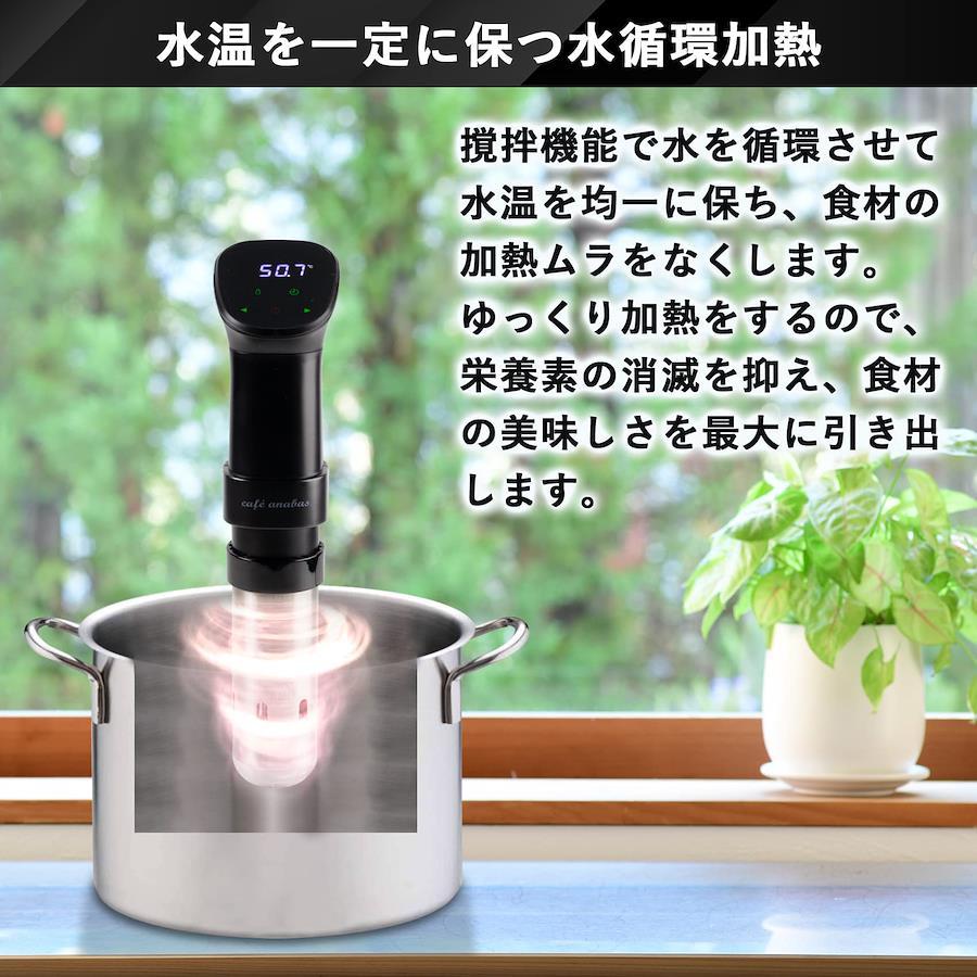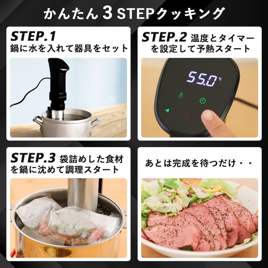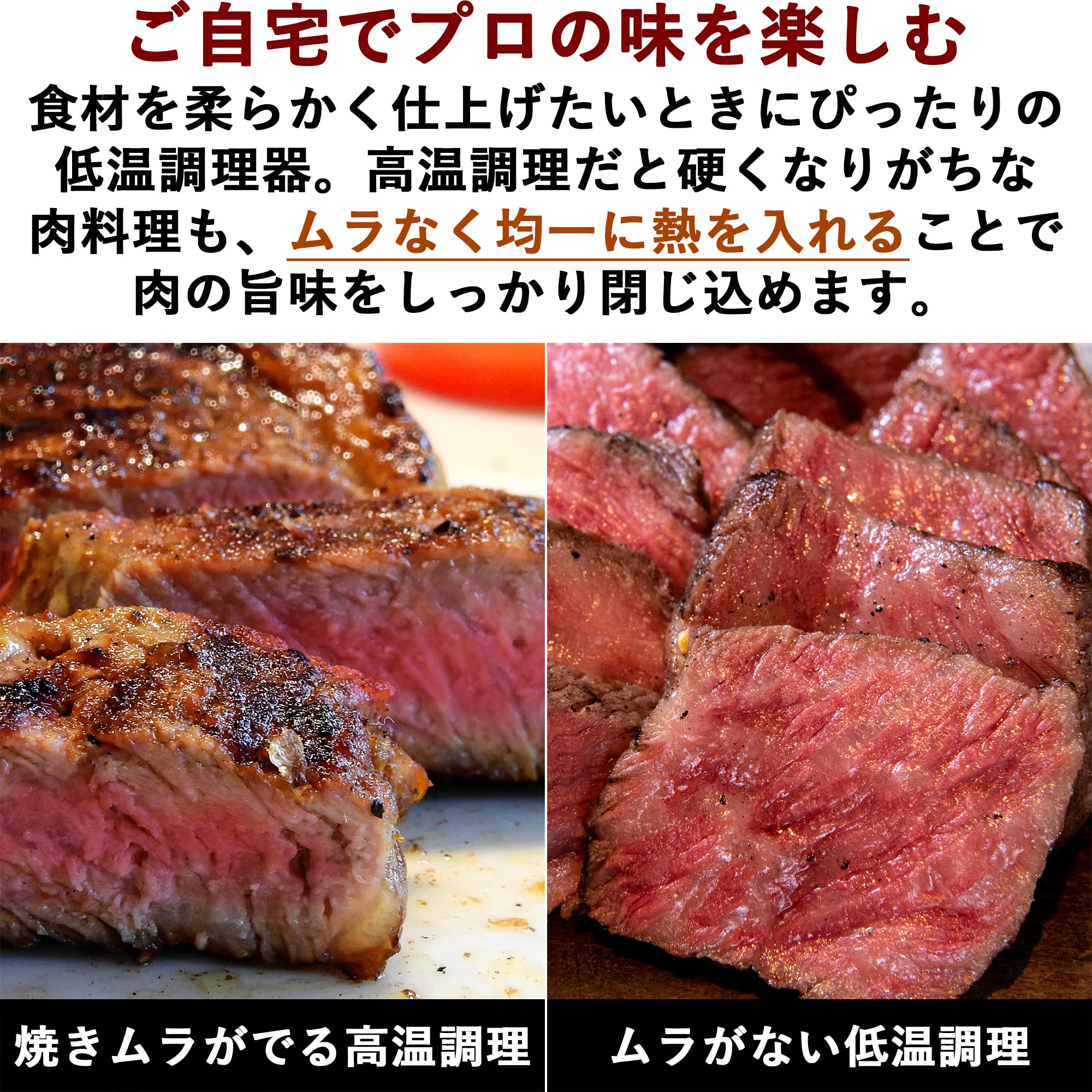 3営業日以内に発送≪新品未開封品≫:【ご自宅で本格調理】食材を柔らかく仕上げたいときにぴったりの低温調理器。高温調理だと硬くなりがちな肉料理も、放っておくだけで柔らかく調理できます。自動で温度管理をしてくれるため、セットしたらあとは待つだけで、プロのような料理に仕上がります。【温度設定】温度は25~92.5℃の間で、0.1℃単位で設定できるので、作る料理に合わせて細かく設定が可能です。キーを長押しすると素早く変更できます。【タイマー】タイマーはは1分~99時間59分の間で1分単位で設定が可能です。設定時間が経過するとアラームでお知らせしてくれるので、加熱しすぎる心配もありません。キーを長押しすると10分単位で変更できます。【簡単調理】①鍋に水を入れて器具をセット。②調理内容や材料の厚みに応じた温度とタイマーを設定して予熱開始。③予熱が完了したら、袋詰めした食材をなべに沈めて調理スタート。④設定時間が経過するとブザーがピピピピピと5回鳴り、調理終了。【商品仕様】◇本体サイズ:幅9.7×奥行9.6×高さ37.3cm ◇本体重量:1.1kg ◇電源コードの長さ:約1.5m ◇使用可能なべサイズ:内径20cm以上、深さ20cm以上、容量15L以下 ◇電源:ACアダプター(入力:100V 50/60Hz) ◇消費電力:850W ◇設定温度:25~92.5℃(0.1℃単位) ◇設定時間:1分~99時間59分(1分単位)
