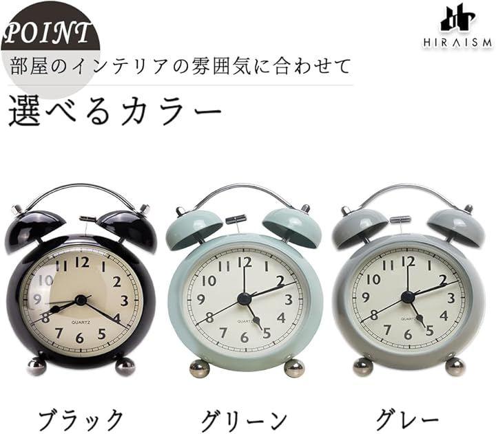 クラシックなベル式タイプの目覚まし時計で、大音量ながら槌で鐘を打つ音色はデジタルにはない温かみを持っています。