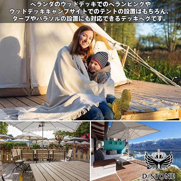 ・ベランダのウッドデッキでのベランピングやウッドデッキキャンプサイトでのテントの設置はもちろん、タープやパラソルの設置にも対応できるデッキペグです。