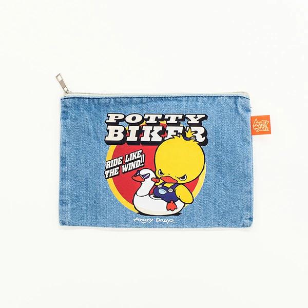 ミックがおまるでイキってるカワイイデザイン♪くたっとした生地感の、フラットなデニムポーチ。オリジナルピスネーム付き。