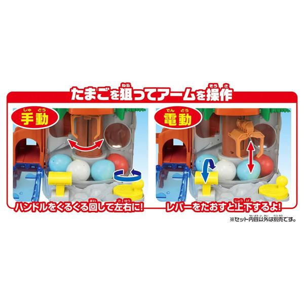 電動のクレーンを使って上手にたまごをキャッチ、たまごの中からはアニアの子ども恐竜が出てきます。