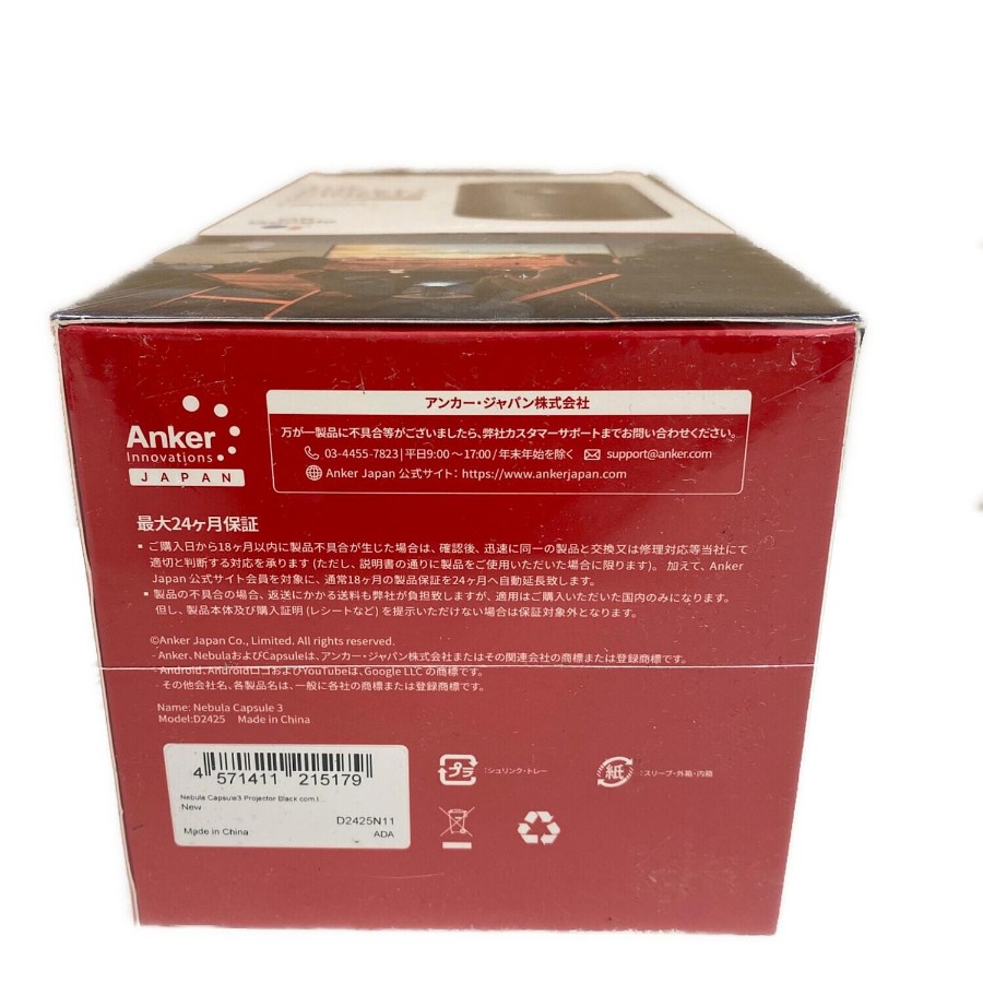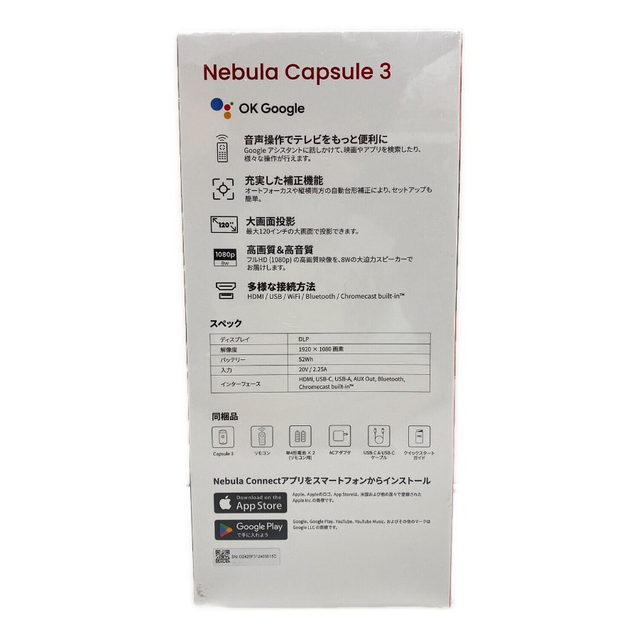 ■商品状態程度S:未使用のお品物こちらの商品は未使用となりますが、検品および撮影のため、外箱や袋を開封することがあります。また、店頭にて展示販売を行っているため記載に無い細かなキズ、ヨゴレが見受けられる場合がございます。■商品説明メーカー:Anker商品名:Nebula Capsule 3型番 :D2425N11発売年:2024年1月25日画素数 :1920x1080輝度 :200 ルーメン投影距離40インチワイド1.06 m60インチワイド1.6 m80インチワイド2.13 m100インチワイド2.65 m備考:Travel Bracket 付き■付属品本体のみ■その他必ず、商品注文される前に店舗情報に記載している注意事項をご確認ください。