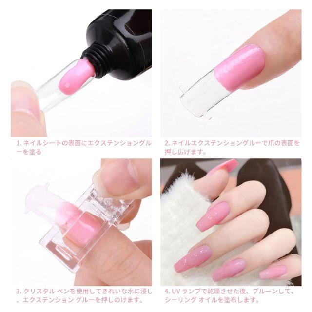 ネイルクリップの使い方:まず、爪の準備を整えます。次にポリジェルを爪に塗布し、ネイルチップを装着します。その後、長さ出しクリップを爪と指にしっかりと固定します。乾燥または硬化が終わったら、クリップを外します