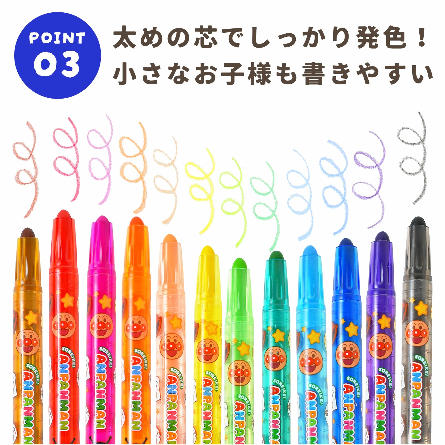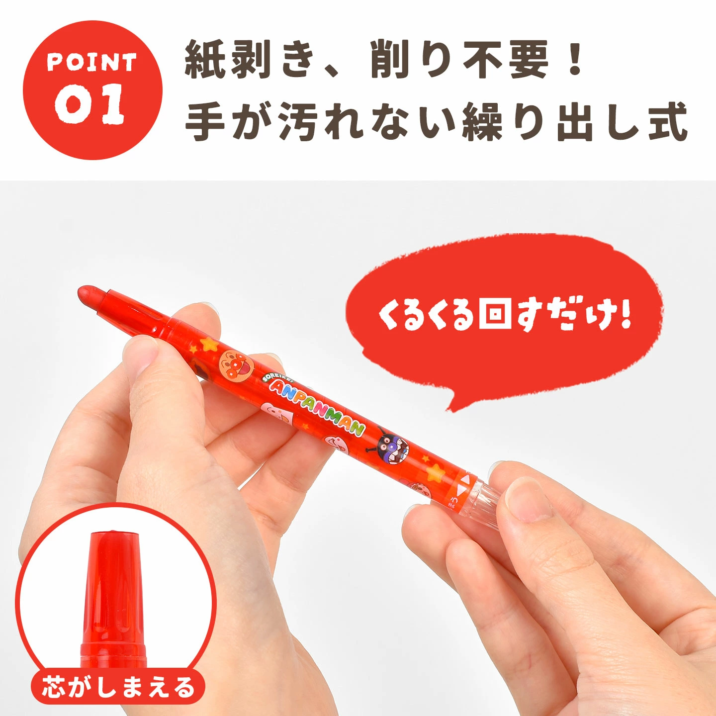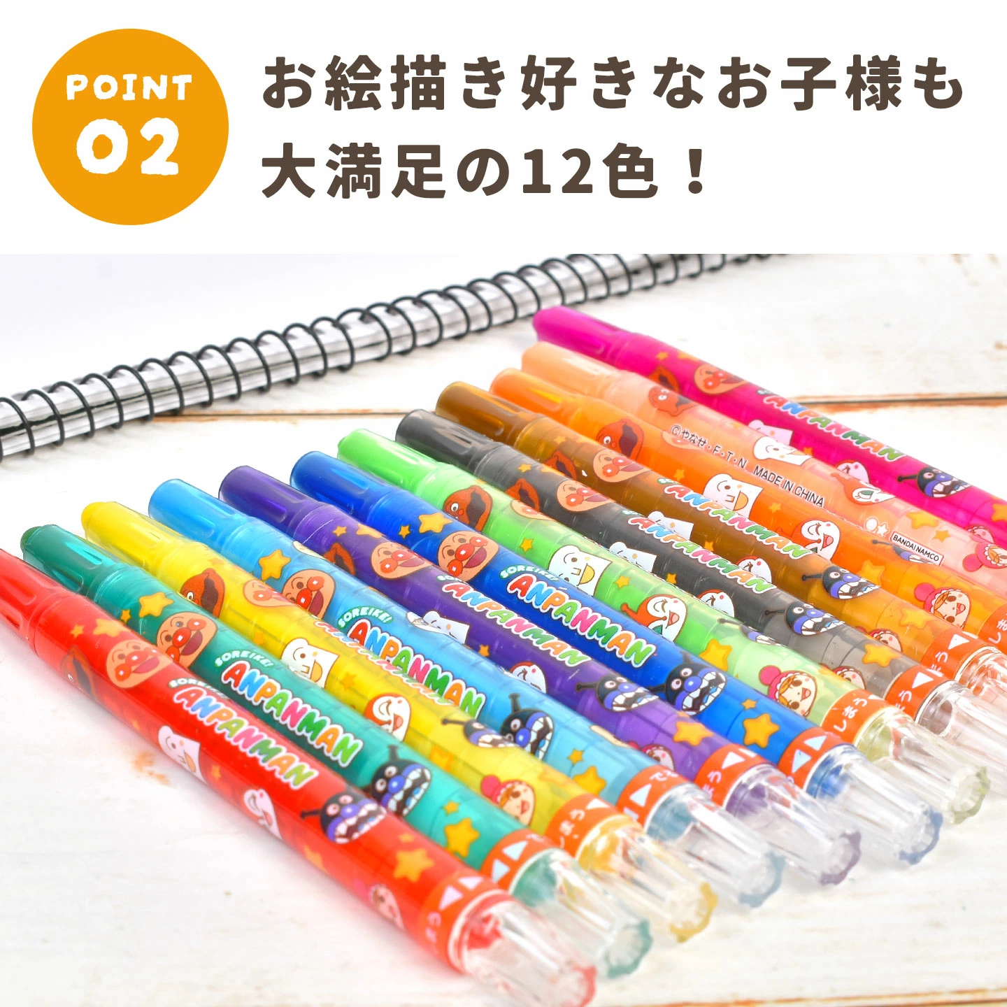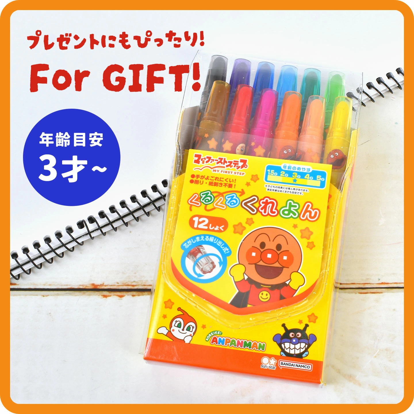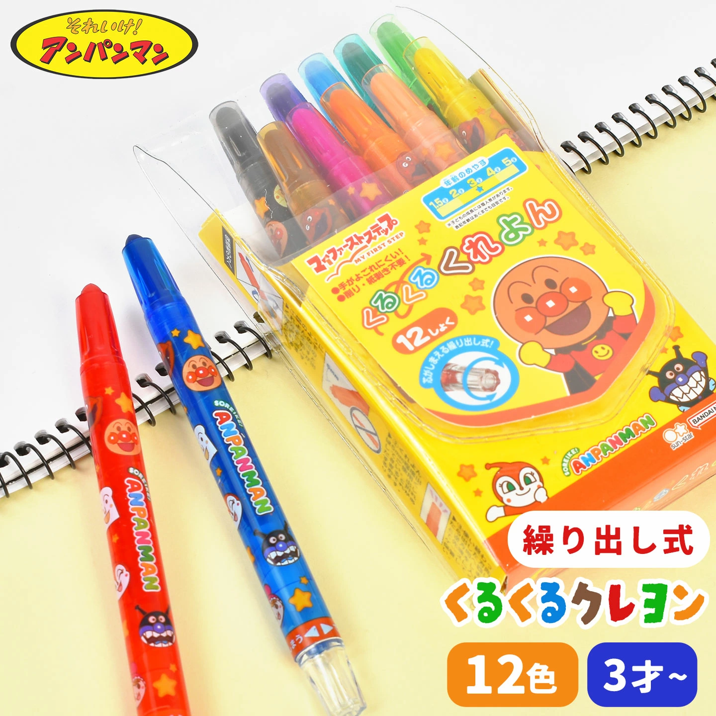 【くるくるくれよん】お子様のはじめてのおえかきにぴったり!アンパンマンたちのイラストがかわいいクレヨン。 くるくる回して芯を出し入れする繰り出し式なので、紙を剥いたり芯を削る必要が無く、手や箱を汚すこともありません。おえかき好きのお子様も大満足の12色!太めの芯でしっかり発色するので、小さなお子様でも描きやすいです。おえかき好きなお子様へはもちろん、お友達へのプレゼントにもオススメです。