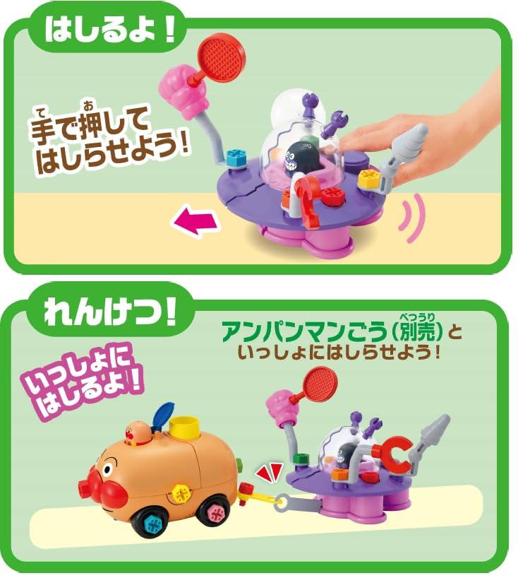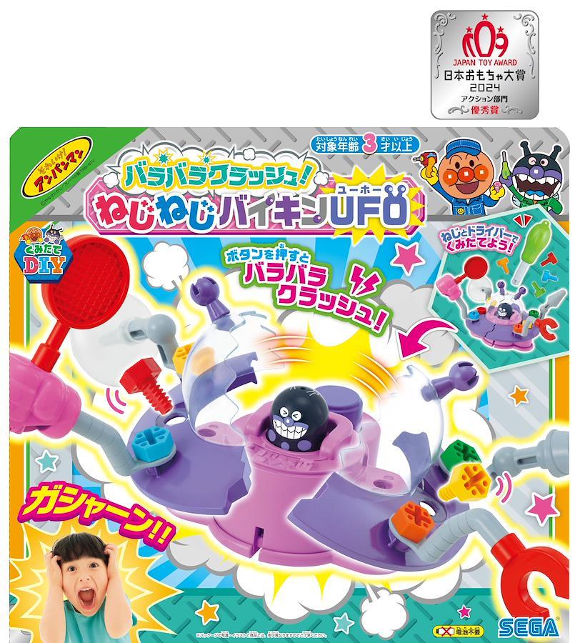集中力・想像力・問題解決力を育むアンパンマンくみたてDIYシリーズです。ねじとドライバーでくみたてよう!ねじねじDIYで作ったバイキンUFOが、ボタンを押すとガッシャーン!一気にバラバラクラッシュ!しっかりとねじをとめたのに、ボタンひとつで一気にクラッシュするからおもしろい!またくみたてたくなる!くみたてたバイキンUFOは手ころがしで走ります。また、付属の連結器パーツを使うと別売「とびだせ ノーズパンチ!ねじねじアンパンマンごう」に連結していっしょに走らせることができます。