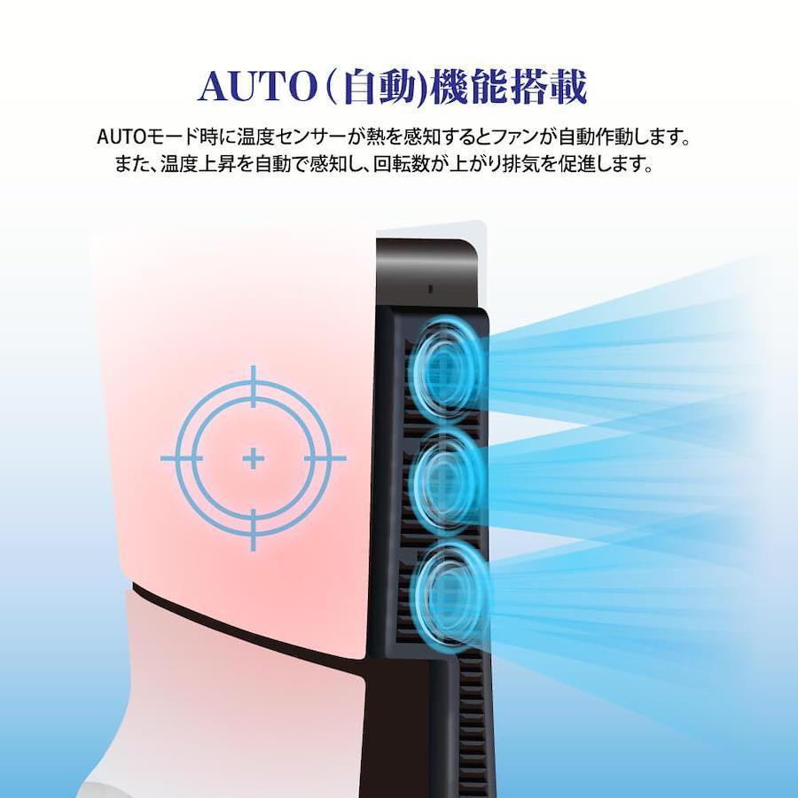 ◆オート機能搭載!オート時に本体に内蔵されている温度センサーが熱を感知し始めると自動でファンが作動します。温度の上昇を自動で感知し、回転数が上がり排気を促進します。