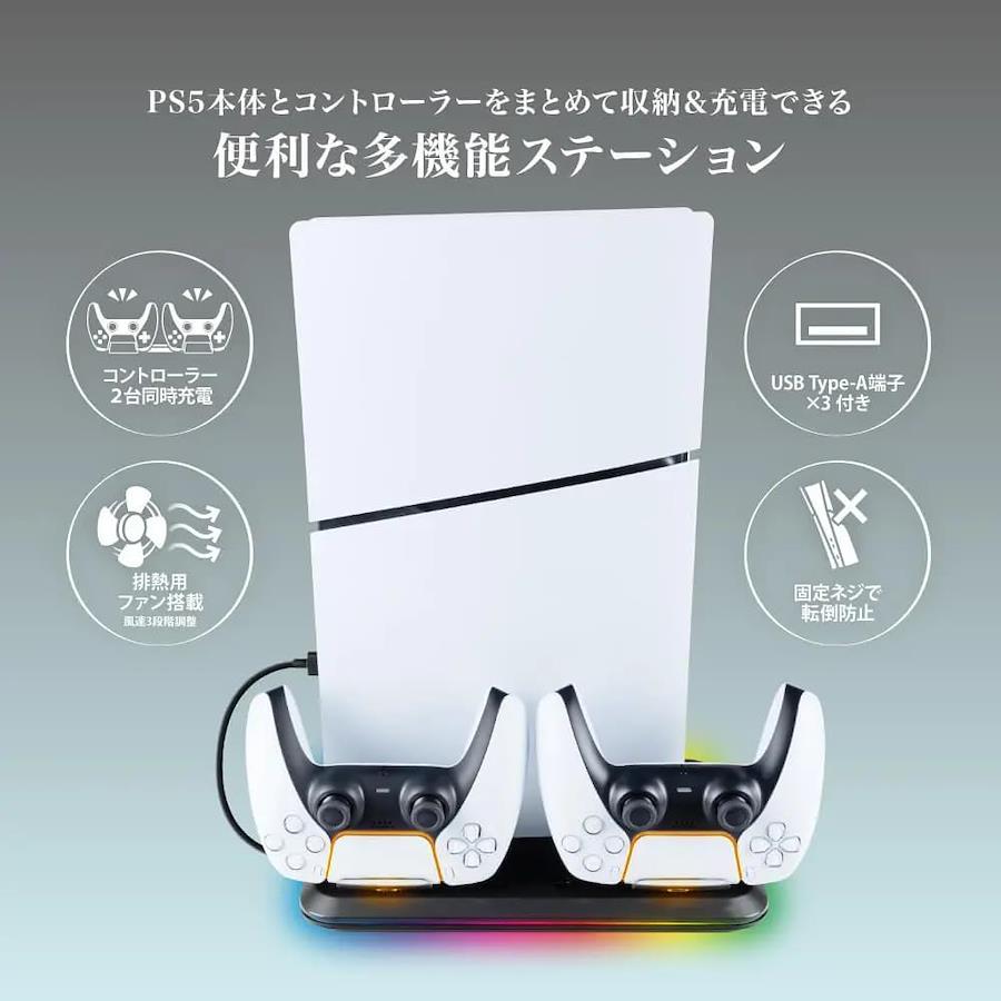◆新型PS5に対応した多機能ステーション!背面ポートから給電するバスパワータイプとなっておりコントローラー充電や排熱用ファン・USBポート・LED点灯などを搭載した新型PS5用の多機能ステーションです。