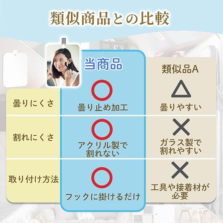 「曇らない加工で快適」お風呂や洗面所の湿気でも曇りにくく、朝のシェービングやメイクに最適な視界を保ちます。