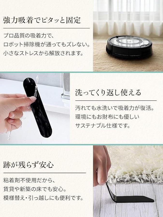 「しっかり貼れて、何度でも使える高性能グリップ」 高品質のPU素材を採用し、強力な吸着力で床や棚にピタッと固定されます。
