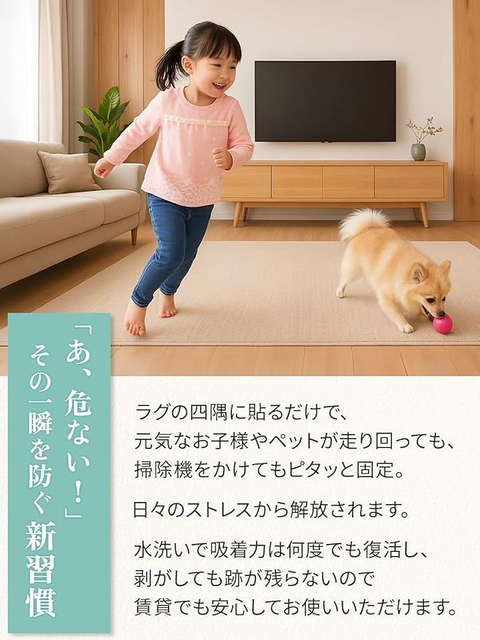 「もう、ヒヤッとする瞬間とはお別れ。安心と快適さに包まれる毎日へ」 不安定な家具や家電が動くたびに感じていたストレスや、お子様やペットが滑って転ぶかもしれないという不安から解放されます。