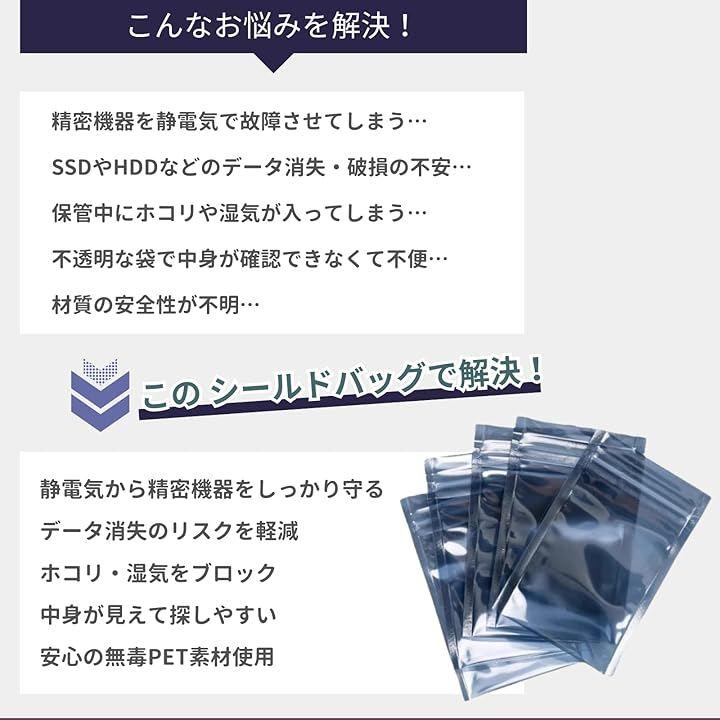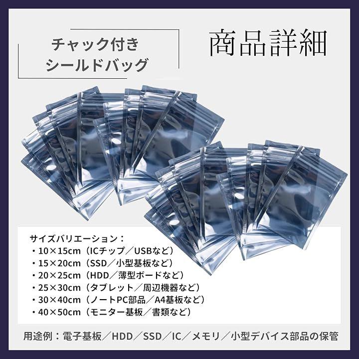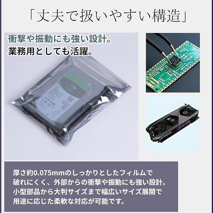 「商品詳細」 サイズバリエーション: ・10x15cm(ICチップ/USBなど) ・15x20cm(SSD/小型基板など) ・20x25cm(HDD/薄型ボードなど) ・25x30cm(タブレット/周辺機器など) ・30x40cm(ノートPC部品/A4基板など) 厚さ:約0.075mm 素材:CPP/A-PET(導電性フィルム) 仕様:チャック付き/半透明/再利用可 用途例:電子基板/HDD/SSD/IC/メモリ/小型デバイス部品の保管・分類・輸送用