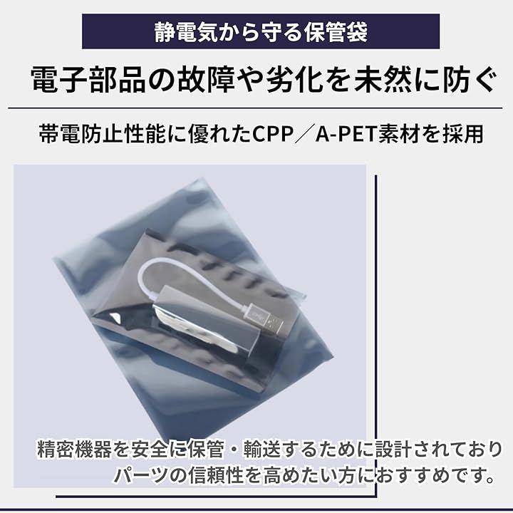 「静電気から守る保管袋」 帯電防止性能に優れたCPP/A-PET素材を採用し、静電気による電子部品の故障や劣化を未然に防ぐ静電気防止袋です。