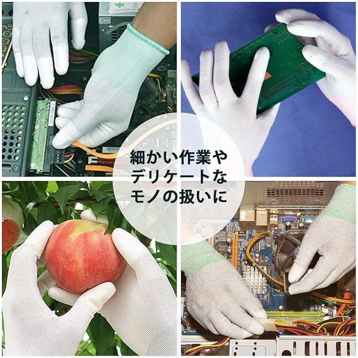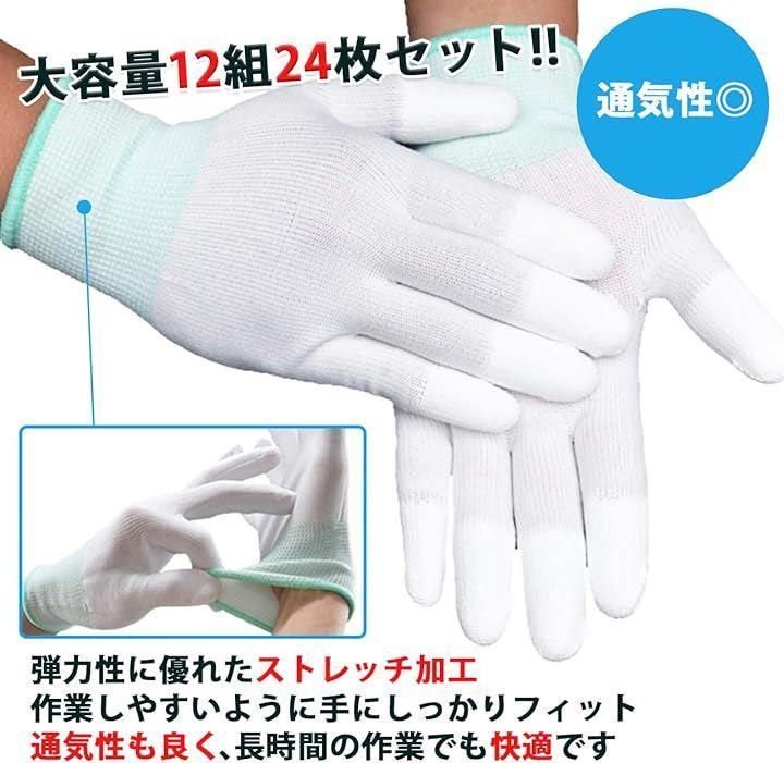 「商品内容」作業用手袋:24枚(12組)<Mサイズ(約)> 全長:21.5cm、中指の長さ:8cm、手のひら周り:18.5cm <素材> 指先:PU 編手:ナイロン カラー:ホワイト *帯電防止、すべり止め
